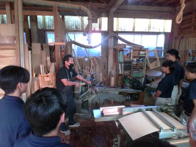 その後の加工工程では、機械への材料のセットの仕方、作業中の姿勢、手順の一つ一つに至るまで、全てにおいて無駄がなく効率的な作業のためのアドバイスをいただきました。熟練の技から生まれる効率と正確性は、生徒たちに大きな感動を与えました。