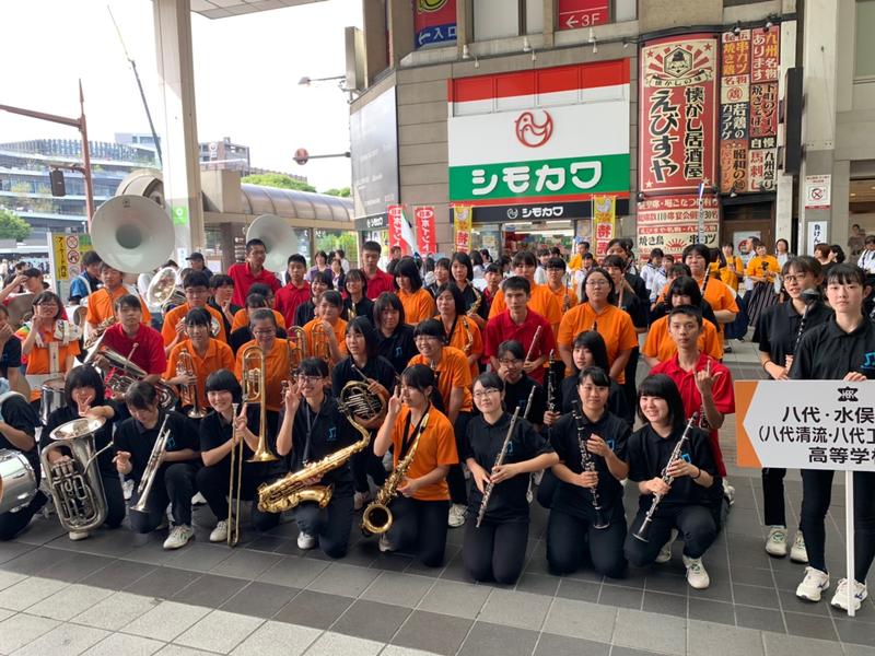 曲目は水俣、八代にちなんで村下孝蔵の「初恋」、八代亜紀の「舟唄」の二曲他で、マーチングアレンジしたものを演奏し、アーケード街が「初恋通り」と化しました!!