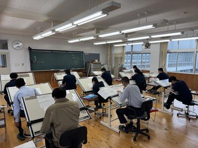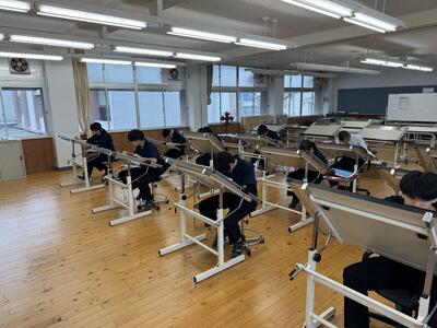 建築科棟の製図室には、日々、心地よい緊張感とともに深い静寂と集中力が満ちあふれています。現在、2年生は木造住宅の断面図や立面図の模写という課題に挑んでいます。その一本一本の線の引き方には昨年度挑んだトレース技能検定の確かな経験が息づいています。単に線を引くのではなく、その一本一本が建物のどの構造を支え、どのような空間を形作るのか、線の意味を深く読み解きながら図面に向き合う姿は、まさに未来の技術者の卵そのものです。