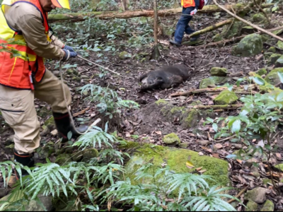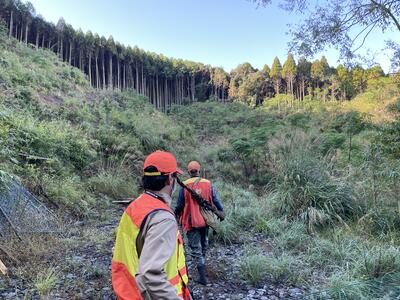 巻き狩り猟は、山に猟犬を放ち、獲物を仲間のいる方向に追い出す役のセコ(勢子)と、獲物を仕留める役のマチ(待ち子)に分かれます。セコが獲物を追い出したら、逃げた方角で待つマチへ連絡を入れ、連絡を受けたマチが獲物を仕留めます。仲間の居場所も把握するため、GPSと無線も使用します。今回は、猟友会の方1人に班員が1人同行し、猟を体験しました。3時間ほど猟を行い、イノシシを1頭仕留めることができました。