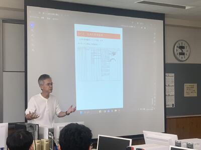 本日は、ジョウ所長にお越しいただき、建築コース3年生に3時間、出来形管理について、講義を行っていただきました。今回も分かりやすく、ICT機器など最先端技術を紹介していただきながら、就職や進学を控えた生徒たちに、技術者や社会人としての心構えを教えていただきました。熱のこもった授業に生徒たちは刺激を受け、熱心にメモを取っていました。また、芦北振興局土木部課長及び建設業協会芦北支部の方々も参加していただきました。