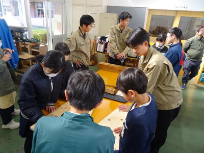 水俣高校建築科が掲げるスローガン、「Design Smiles, Build Future!(笑顔をデザインし、未来を築く!)」。 この理念を体現するプロジェクトとして、1月20日、水俣第二小学校の6年生を本校の実習棟に招き、建築科1年生による「卒業記念品制作」のワークショップを開催しました。
