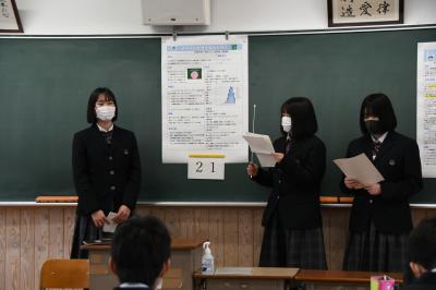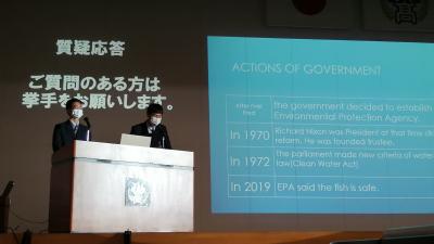 各教室に分れて39種類のポスター発表が行われました。環境問題だけでなく、芸術や工学など様々な分野について各グループでまとめました。その発表内容は興味深いものばかりで、勉強になりました。オーディエンスの1年生が積極的に質問していて、活気あふれる有意義な発表になりました。