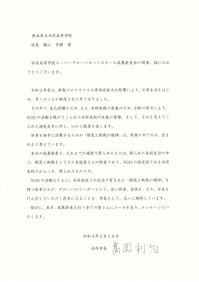 また、水俣市長の髙岡様からも激励のメッセージをいただいております。応援ありがとうございます。