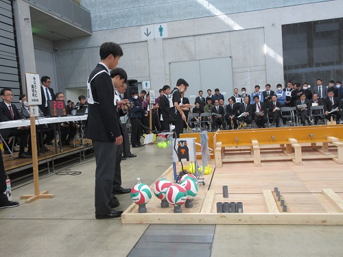 一方、くまもと物産フェアのイベントとして、第26回熊本県高等学校アイデアロボット競技大会も販売会場と隣り合わせで行われました。本校からは機械科の生徒が制作したロボット2台が出場しました。競技は、本年度山口県で開催された全国大会の競技内容に基づいて、16チームが優勝目指して熱戦を繰り広げました。予選の結果、本校の「水公さんと風待号」が決勝トーナメントに勝ち残り、最終的には総合6位、敢闘賞をいただきました。2チームともに、これまで熱心にロボットづくりに取り組んできた成果を十分に発揮できた大会だったと思います。