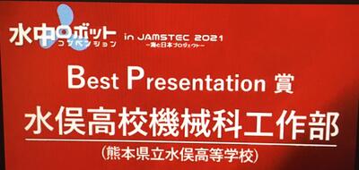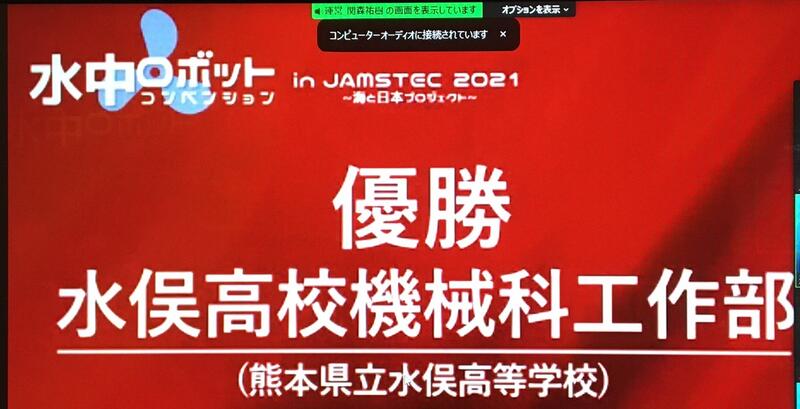 水俣高校機械科3年生の有志3名が、日本で最大の水中ロボットの祭典である水中ロボットコンベンションin JAMSTEC 2021のジュニア部門に出場しました。コロナ前は20チーム近くの参加がありましたが、今年もコロナ禍で部活動中止が相次いで辞退する学校が多く、全国の高専、高校、中学校から8校の参加でした。