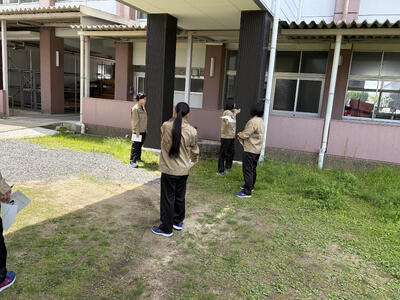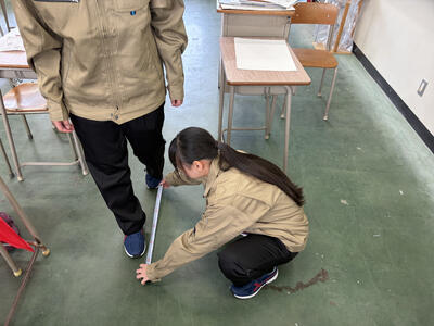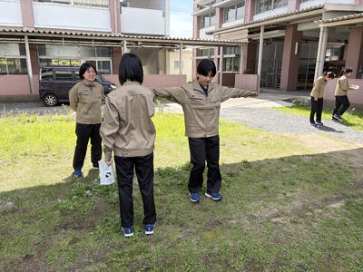 建築科では、先日1年生が真新しい実習服に身を包み、建築の第一歩となる記念すべき初めての実習に取り組みました。今回実施したのは、自分の歩幅で距離を測る「歩測」や、腕や指の長さを使って感覚を養う「体測」です。一見シンプルですが、自分の身体を物差しにするこの学びは、すべての建築・土木の原点となる大切な感覚です。生徒たちは自分の身体が測量器具になる面白さを体験しながら、チームで協力して熱心に取り組んでいました。