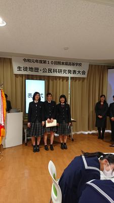 令和2年2月15日(土)、熊本大学グローバル教育カレッジ棟で開催された第10回熊本県高等学校生徒地歴・公民科研究発表大会に1年普通科、一住連さん、山本さん、吉本さんが参加しました。