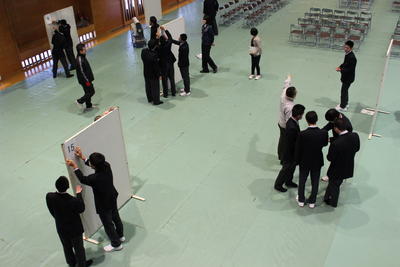 1年生が会場の設営、2年生とステージ発表者達は明日の発表に向けたリハーサルや最終打ち合わせを行いました。明日はこれまでの研究の集大成をお披露目する場でもあり、みんな最後まで発表内容を詰めていました。