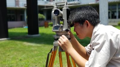 梅雨の晴れ間の測量実習です。暑い中、2年建築コースの実習でセオドライト(トランシット)測量実習が行われました。実習棟周りに4カ所の測点を設定し、全員で協力しながら土地の角度を測量し、データの検証を行いました。初めてのセオドライト測量でしたが、さすが2年生!、測量誤差も許容範囲でした。