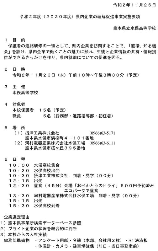 令和2年度(2020年度)県内企業の理解促進事業を活用し、企業訪問として摂津工業株式会社と河村電器産業株式会社水俣工場の2社を保護者様と職員で訪問いたしました。進路を検討する上で有意義な機会となりました。