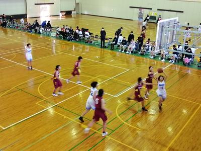 一回戦の悔しさをバネに、前半はディフェンス重視の試合展開を見せます。相手の主力選手にボールを持たせないよう、積極的にパスカットして流れをつかみました。後半は2年生選手の3Pシュートが多く決まり勢いをつけます。積極的に相手のボールを奪い速攻を出して、20点差離して勝利しました。