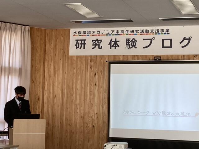 12月18日(土)、水俣市環境アカデミアで研究体験プログラムの第3回目が実施されました。 今回のプログラムの目的は、「現在自分が答えを知らないことについて、答えを知ろうと挑戦し、その結果を発表する。答えを知るための手順は自分で考える。」という体験プログラムです。水俣の子どもに探求活動の楽しさを知ってもらおうという目的で水俣市が企画されて、今年で3年目になるプログラムです。本校から4名、市内の中学校から1名参加して本日の最終発表が行われました。