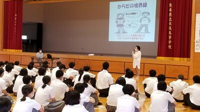 7月4日(月)性教育講演会が行われ、全校生徒が参加しました。「くまもと被害者支援センターゆあさいどくまもと」から2名の講師をお招きし、「安心・安全な関係のために~性暴力について考えてみよう~」の演題で講話をしていただきました。