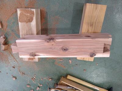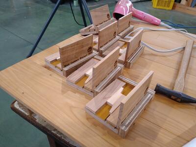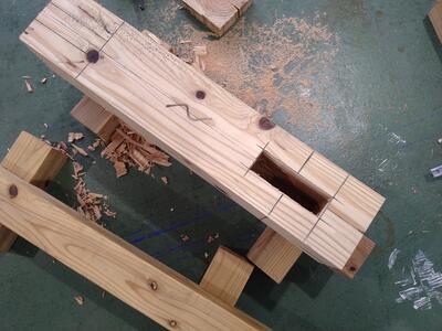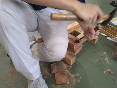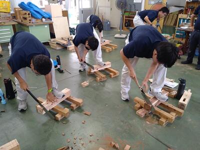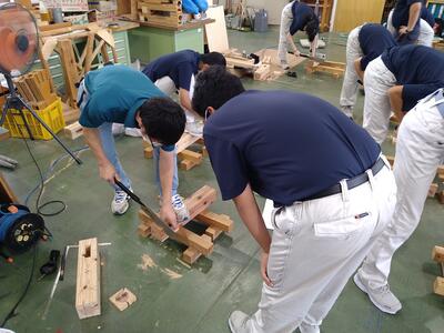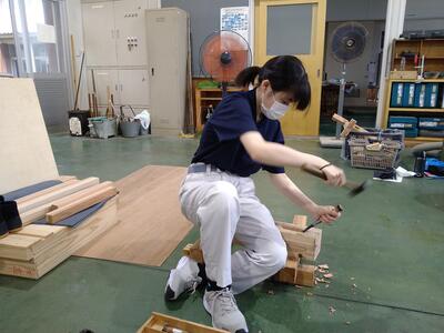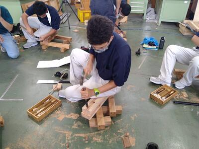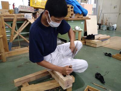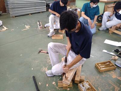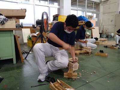 今回は鑿(のみ)であな掘り作業を行いました。工具や木の性質を学んでいる生徒たちは、工具の持ち方、木の繊維方向などを見極め、丁寧かつ早さを意識して作業を進めていきます。外の雨音に負けない、トントン、コンコンという心地よいリズムが実習棟に鳴り響き、完成したときは汗をかきつつも、晴れやかな生徒たちの表情が印象的でした。