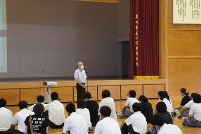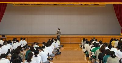 性の境界線の話や、性被害について年代別被害件数等のデータを活用した具体的な話など、高校生が陥りやすい性についての誤解や失敗についてもお話をいただきました。ときおりクイズ形式で生徒に質問しながら、デリケートな内容についてもとても分かりやすく話してくださり、熱い体育館の中ではありましたが、生徒も最後まで真剣に講話を聞いていました。