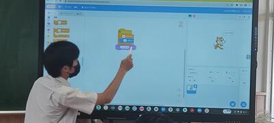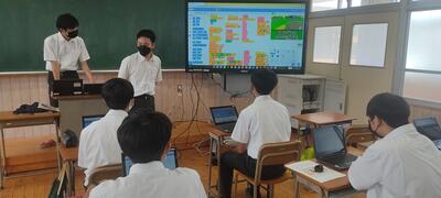 電気コースの1、2年生を同じ教室に招いて、1時間Scratch(スクラッチ)というプログラムでキャラクターを動かす内容を3年生が教える形でシミュレーションをしました。説明にかかる時間を計ってみたり、説明の問題点を探すなどし、改善していていきました。