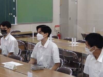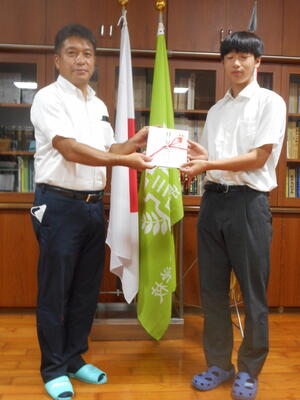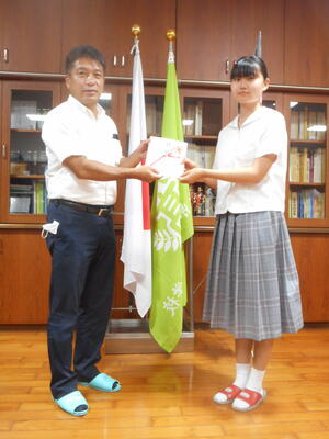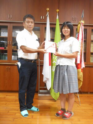 本校同窓会会長の澤村様においでいただき、出場生徒へ7月20日(水)に本校校長室にて激励金贈呈式が行われました。本校生への期待と応援のことばをいただきました。