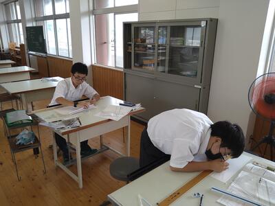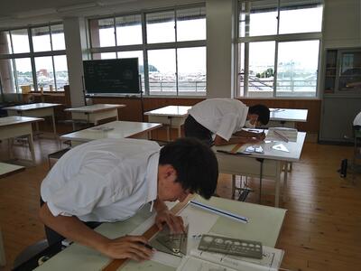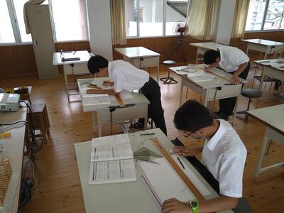 建築コース1年生は、製図の作図法もかなり身につけてきました。今は、軒先周詳細図を作図しています。今までの課題で学んだことを活かし、自ら図面を読みとり、寸法や縮尺を考え、定規などを使い、真剣かつ集中して取り組んでいます。主体的に考えること、さらに分からないときは質問するなど積極性も伸びてきました。
