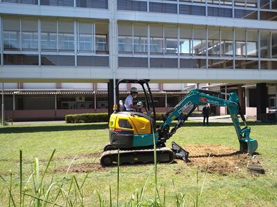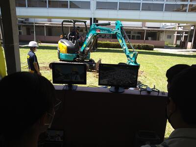 工事現場で使う重機を巧みに操作し、小さい石を積み木のように重ねていく様子は、まさに職人技。積み上がったときは、中学生だけでなく、建築コースの生徒からも拍手と歓声が上がっていました。また、ドローンも本校上空に飛ばしてもらい、準備していただいたモニターから映像をみせていただきました。