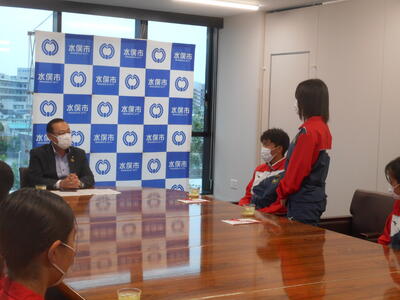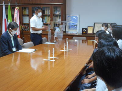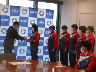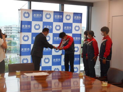 本校生徒は、カヌースプリント競技で両大会に出場することが決まり、7月19日(火)に水俣市役所にて出場生徒への激励金贈呈式が行われました。高岡利治市長から応援のことばをいただき、各選手は大会への抱負を述べました。