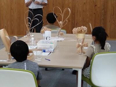 始めに建築コース3年生が作成した、山林についてのプレゼンをしながら、参加者の皆さんにはワークシートを完成してもらいました。その後、木の加湿器製作では、建築コース2年生も加わり、皆さんと木の性質や手触り、香りを感じながら楽しく活動できました。さらに、大工技能士の本校生やものづくりマイスターによるかんなやのこぎり引きの実演及び体験も行いました。