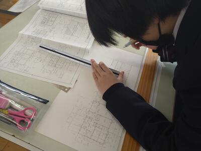 平行して同じ時間に建築コースでは、「建築製図」をしています。今は、床伏図といって、床下の図面を描いています。黒板に描かれた見本や、模型を参考にしながら描き進めています。CAD(キャド)といって、コンピュータで作図もしますが今日の授業では手描きを学びます。なお、建築士の実技試験は手描きです。