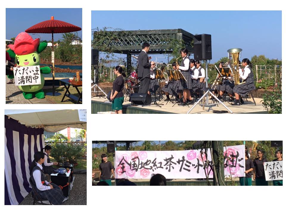 11月5日(土)にエコパークで、第16回全国地紅茶サミットinみなまたのプレイベントが開催されました。暖かな日差しのもと、野外ステージにて、吹奏楽部と書道部はコラボパフォーマンスを行いました。「紅茶」ではありませんが、茶華道部は野点を行い、お抹茶を振舞いました。午前・午後あわせて3回、合計60席分すべて満席の賑わいでした。