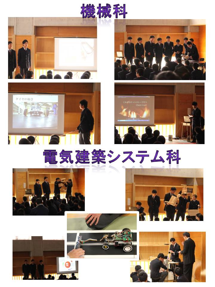 1月19日(木)機械科、電気建築システム科の3年生による課題研究発表会が行われました。課題研究発表とは、3年生が班ごとに分かれて1年間かけて研究した内容を、クラスメイトや1・2年生にむけて発表することです。約10分間、パワーポイントを使ったり、製作物で実演したりと、各班分かりやすく発表していました。来年度は、新3年生が今回の発表内容を引き継ぎ、さらに内容が深まるように研究していきます。