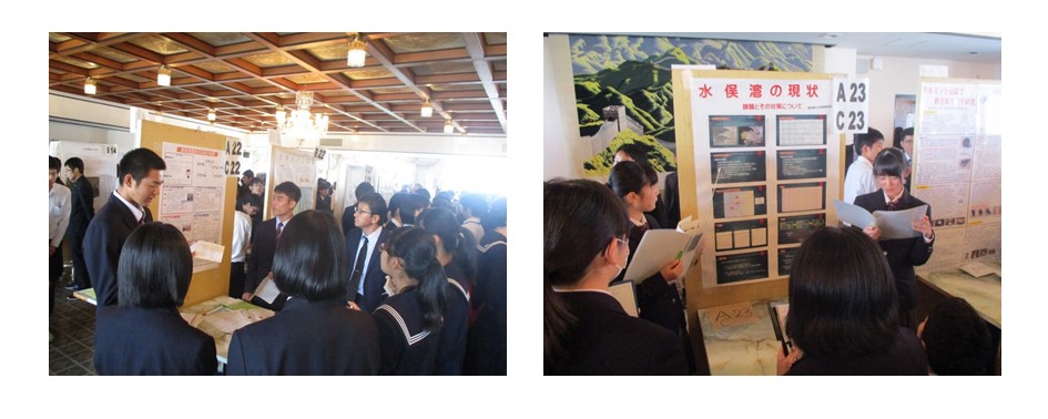 水俣高校からは8グループが参加して、「環境問題発生流域の地理」「環境問題発生流域の産業」「環境問題発生流域の歴史」「水俣湾の現状」「環境問題からの再生」「世界における水銀被害」「世界のゴミ問題」「環境ビジネス」のテーマに基づいた研究の成果を発表しました。