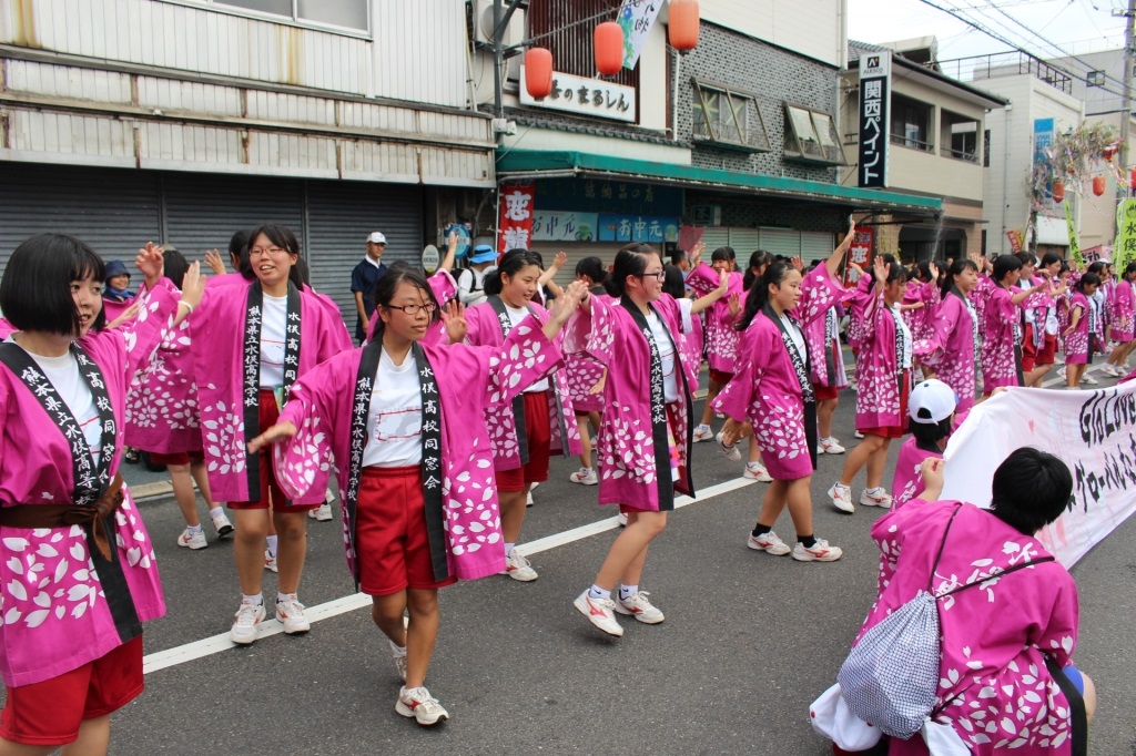 7月22日(日)に水俣市の地域の祭りである恋龍祭へ生徒・職員・PTAが一体となって参加しました。水俣駅から水俣高校までの道を男子は神輿を担ぎ、女子は3カ所のアピールポイントでダンスを披露し、恋龍祭を盛り上げました。学校へ帰着後はPTAからかき氷と飲料水の差し入れをいただきました。