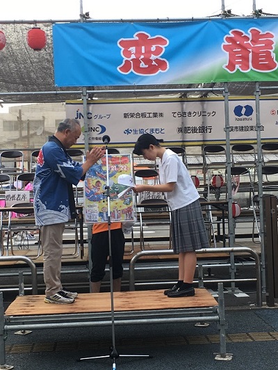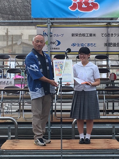 7月21日(土)夕方、肥後銀行特設駐車場にて、恋龍祭ポスター・パンフレット採用制作者記念品授与式が行われました。ポスター採用者の岩生さん、パンフレット採用者の岩井さんが出席しました。