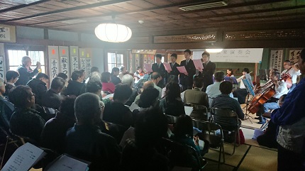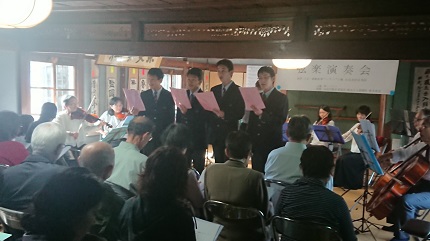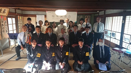 10月28日(日)、徳冨蘇峰・蘆花生家で行われた弦楽演奏会に、音楽部の生徒4名が参加しました。この演奏会は徳冨蘆花生誕150年記念事業の一つとして行われたものです。人吉の弦楽アンサンブル楓の皆さんと一緒に徳冨蘆花作詞・犬童球渓作曲の「水俣第一小学校校歌」と、犬童球渓の代表作である「旅愁」の2曲を演奏しました。ちょっと緊張した様子でしたが、満員のお客様から温かい拍手をいただくことができました。