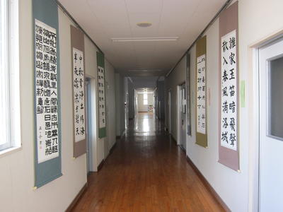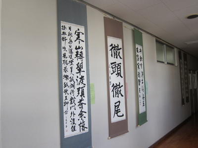 3年生の書道選択者11名の作品を現在本校2階の職員室・会議室前の廊下に展示しています。3年間学習してきたことを活かして「半切(はんせつ)」という大きいサイズの紙での作品制作に挑戦しました。一字一字のバランスはもちろん、作品全体の構成・墨量・書体毎の特徴なども押さえながら時間をかけて制作しました。また、紙の皺伸ばしや軸に作品を貼る作業まで全部自分たちで行いました!2月末までの展示予定です。ぜひご覧下さい!