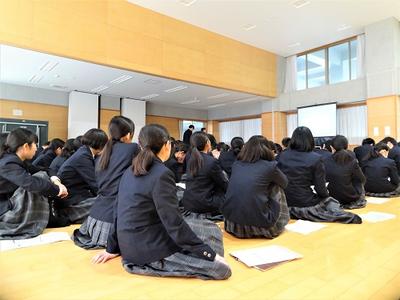 最初に生徒を代表し保健委員より年間の活動報告、その後伊藤先生に「学校生活におけ口腔内の怪我について」と題して、講話をしていただきました。伊藤先生が今までの診療で経験された怪我についてお話いただき、その予防法を教えていただきました。これからの学校生活で活かしていきたいと思います。また、虫歯は自然治癒することはありません。歯の健康について改めて考えていきましょう。