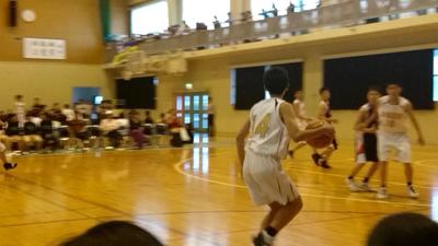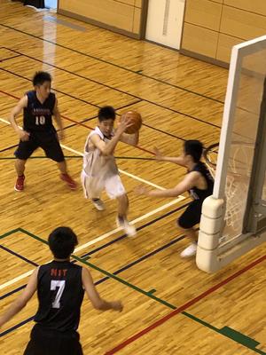 1試合目は鹿児島高専でした。試合序盤はリードしていましたが、中盤にディフェンスの隙をつかれ、15点差ついたところから一気に追いつかれてしまい、一進一退の攻防となりました。試合終盤にはカットインや3Pシュートで点差をつけることができ、手に汗を握りましたが辛くも勝利出来ました。試合終了3秒前に3月の錬成会でも決まったハーフラインからの超長距離3Pシュートにチャレンジしましたが、惜しくもリングに当たるという結果で終わりました。
