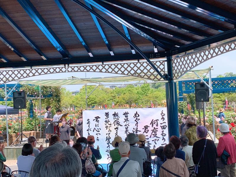5/5ローズフェスタに参加してきました。吹奏楽部の演奏をバックに書道部の書道パフォーマンスで始まり、その後は吹奏楽の演奏を4曲ほど披露しました。