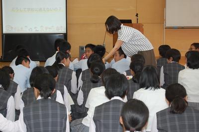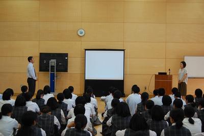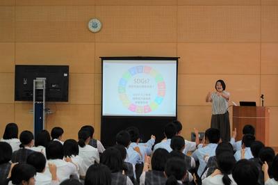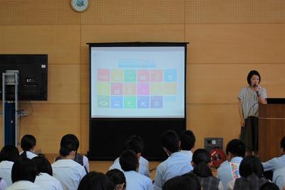 5月22日(水)に、本校体育館において、JICAデスク熊本国際協力推進員の赤星亜朱香様を講師に迎えて、1年生を対象に「SDGs?持続可能な世界とは?」をテーマに御講演いただきました。講演では、青年海外協力隊やシニア海外ボランティアとして活動された東ティモール民主共和国やミクロネシア連邦の様子をはじめ、開発途上国の現状だけでなく、日本の課題を示されました。また、様々な課題の解決策の手段としてSDGsの視点で考えることを提案いただきました。世界のみならず自分の身近な問題に対しても、世界共通のSDGsの視点で取り組むことで、持続可能な社会を構築することが可能だということを学ぶことができました。