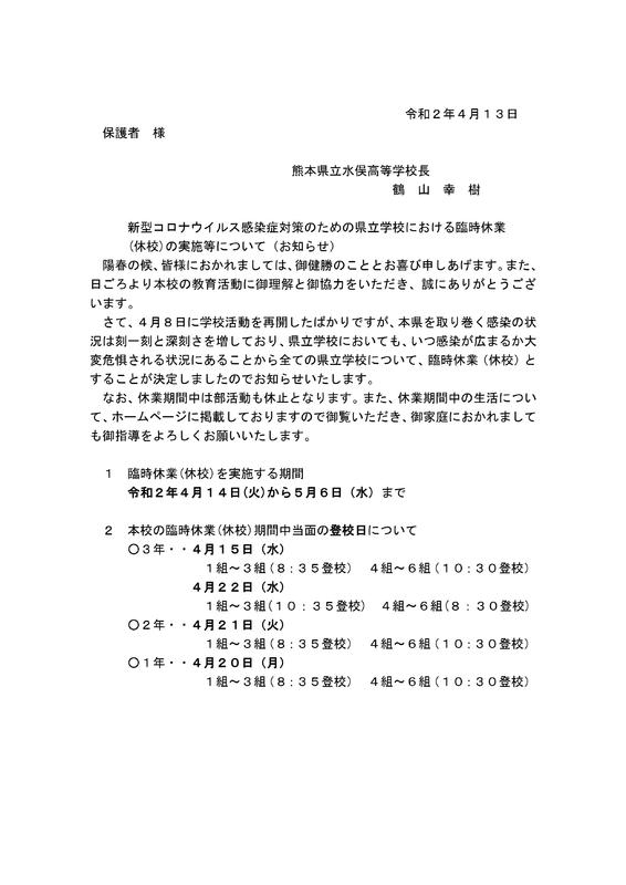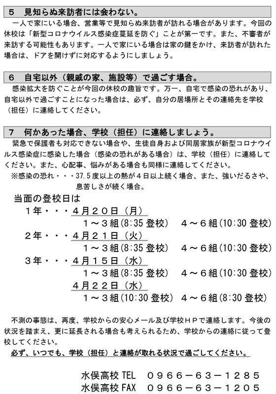 また、今後の登校日等の今後の教育活動については、決定後、安心メールおよび学校ホームページにて追ってお知らせします。