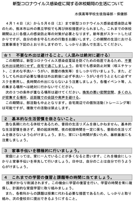 4月20日(月)から22日(水)までの学年ごとの登校日に標記の文書2部を、生徒を通じて配付します。