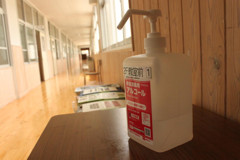 消毒液は登校した際や各授業の合間に利用するよう、生徒たちへの呼びかけを行っています。