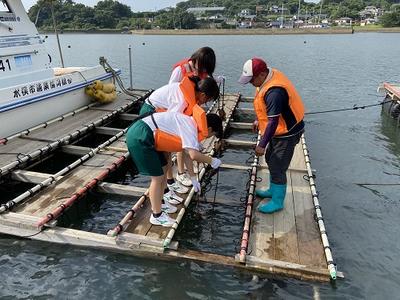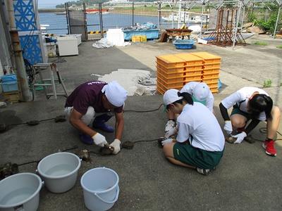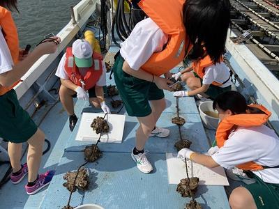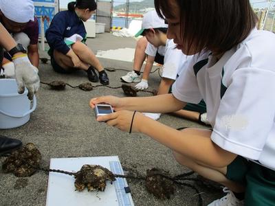 SGH事業の一環で、平成29年度から国立水俣病総合研究センターの協力のもと、水俣湾の水質調査を行っています。調査の結果、水俣川が海よりも栄養塩が多く含まれていることが分かったので、昨年度から水俣川でカキを生育することになりました。今回は、比較調査のため生育している水俣の丸島港と袋港のカキの生育状況を調査しました。3月に設置して4ヶ月ですが、かなり大きくなっているのもあり、これからの成長が楽しみです。