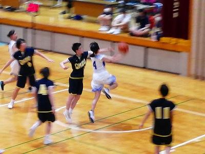 スタメンは3年生と新部長の2年生。大津高校はベスト4にも入る強豪校ですが、怖気づくことなく攻め入ります。ドライブでディフェンスを抜けなんとかゴール!相手のファールが重なりフリースローのチャンスにも恵まれ、1ピリは相手に5点差まで迫ります。しかし、2ピリ以降は一気に流れが相手チームへ。パスカットされ、リバウンドも取れず苦しい展開に。前から当たる相手チームの攻撃に体力を消耗し、ボールを運ぶもゴールに入らず。リズムを乱され点数は伸びませんでしたが、強いチーム相手によく検討しました!