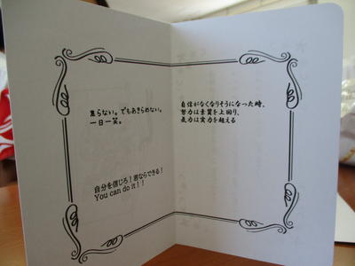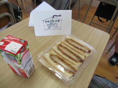 式終了後は、各教室に戻り、カツサンドを頂きました。そして、保護者クラス役員の皆さんと3学年の先生たちからのメッセージカードも贈られました(一人一人違うメッセージが入っています)。