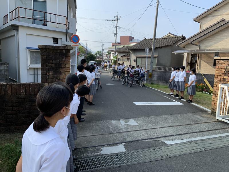 1学期の終業式の朝に引き続き、2学期最初の朝も生徒会挨拶運動を行いました。