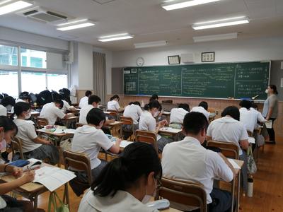 3年生の普通科特進コースでは受験に向けて夕課外を実施しています。英語の夕課外では、英語特化型コース、国公立大コース、私大・短大・専門学校コースに分れ、進路先に対応した入試対策をしています。総合型選抜(AO)や学校推薦型選抜(推薦)の時期が着々と近づいているので、気合い入れて勉強しています!