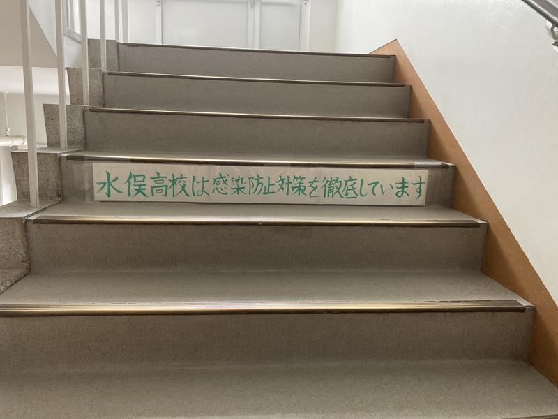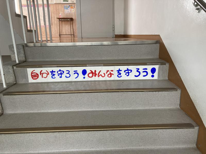 保健委員を中心に新型コロナウイルス感染拡大防止に向けた啓発メッセージを作成し、各階段で掲示しています。階段を上るときに常に視界に入ってきて、注意しようという気持ちにさせてくれます。