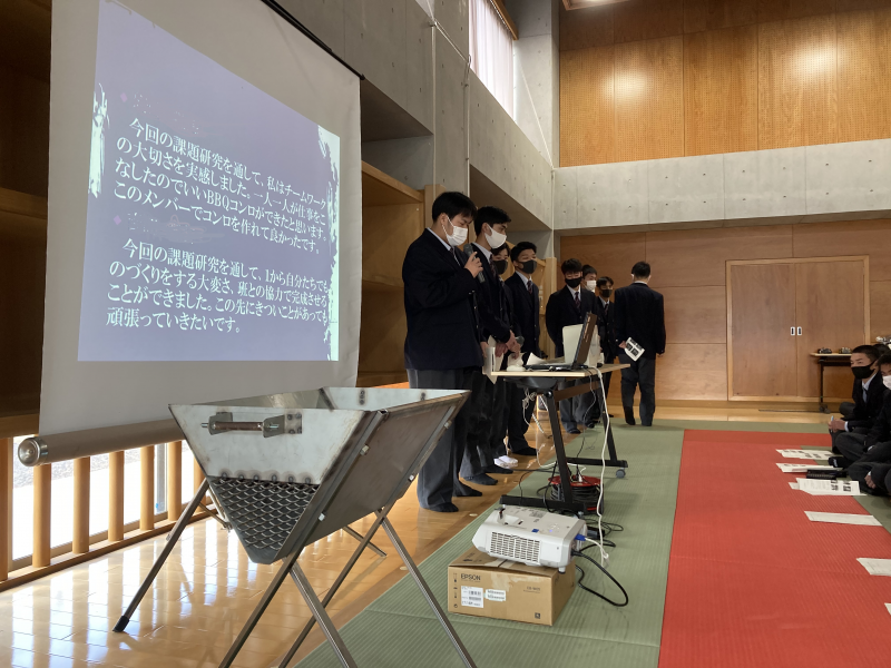 機械科では、バーベキューコンロや箱罠の製作と、マイコンを使った各種ロボットの製作研究が発表されました。利用する人の立場に立った視点で製作することや、改善を繰り返しながらよりよいものを作り上げていくことに各班取り組んでおり、ものづくりの大切な観点を学んでいたようです。