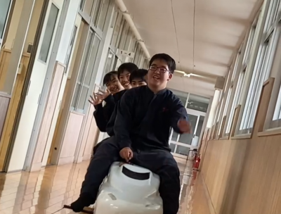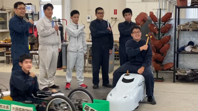 撮影では、工作機械で作業している風景やエコ電カー、ミニ新幹線、EVバイクに乗って運転しているところなどを撮っています。生徒たちも笑顔あふれて楽しんで取材を受けていました。実際にどの場面が使われるかは6月から放送されるCMを楽しみにワクワク・ドキドキです