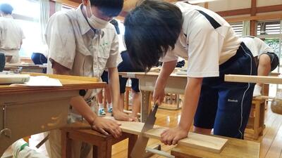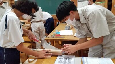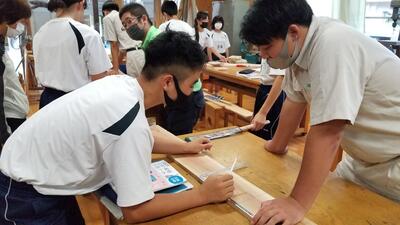 7月15日(木)に、電気建築システム科3年生が津奈木中学校へ出向き、技術の授業を行いました。中学2年生の皆さんが、自分で考えた木製本棚を作っているところに、電気建築システム科3年生が技術指導を行います。